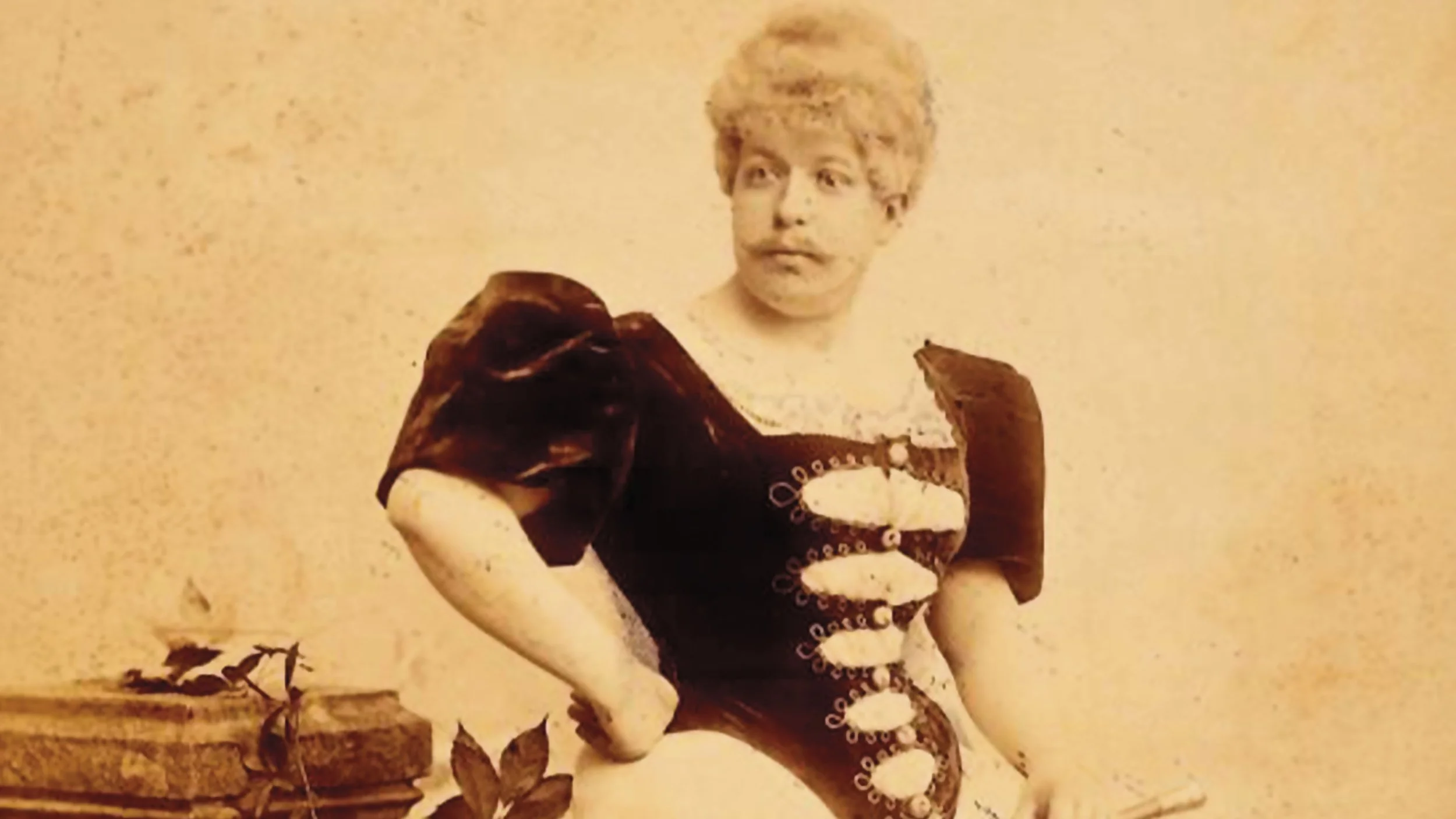 Valokuva viiksekkäästä henkilöstä, joka on pukeutunut aikansa naisten vaatteisiin; hänellä on yllään korsettityyppinen puku, sukkahousut ja kädessä ruoska. Valokuva n. 1896 Richard von Krafft-Ebing.